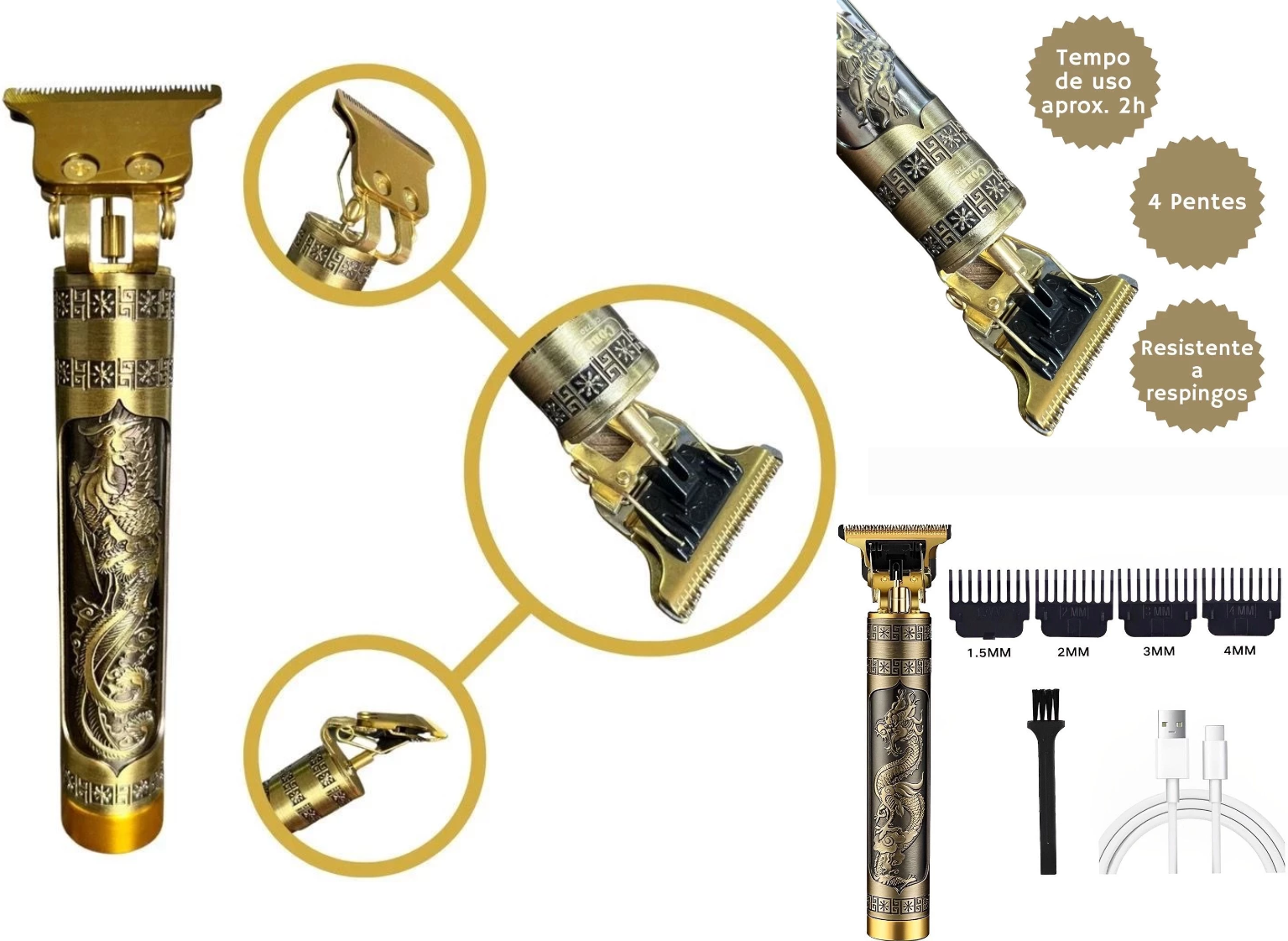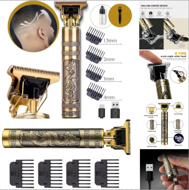 Design Icônico e Funcional e Inspirada no estilo vintage a MÁQUINA DE BARBEAR BLADER, nas barbearias clássicas, esta máquina não é apenas bonita, mas extremamente funcional. O corpo metálico robusto com o icônico relevo de dragão oferece uma pegada firme e confortável, enquanto o sistema sem fio proporciona total liberdade de movimento durante o uso e com a resistência a água.