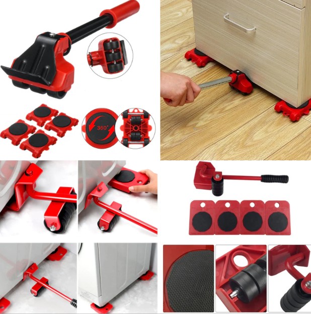 O Kit completo, com 01 unidade inclui 5 peças 4 carrinhos com rodinhas giratórias e 1 alavanca, para o movedor de móveis pesados, tudo que você precisa para mover móveis grandes e pesados com agilidade e facilidade.