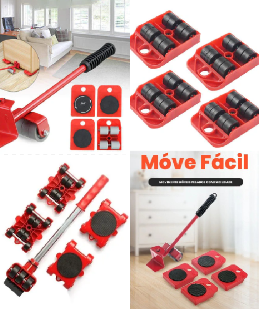 O KIT MOVE FÁCIL é um conjunto de ferramentas de ALAVANCA E BASES COM RODINHAS, que combina perfeição e robustez, é ideal para mudanças e a organização da casa, suportando pesos consideráveis. Seu funcionamento com um sistema que eleva o móvel e coloca-se as rodinhas embaixo, facilitando o deslize suave, com resultados impecáveis e transformando sua qualidade de vida.