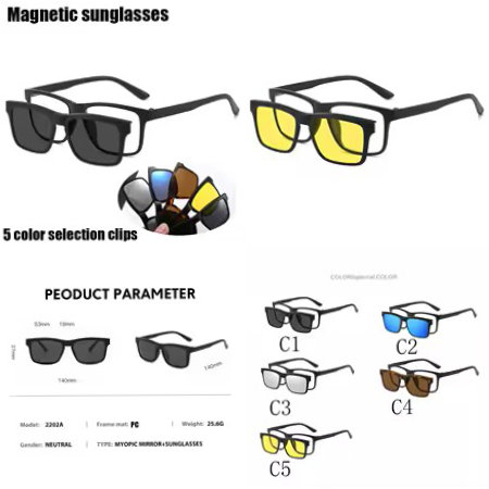 ÓCULOS MAGNÉTICO 5 EM 1 inclui armação de grau + 4 clipes, para o dia de sol ou noite: Preto, Espelhado, Noturno, Cores azul e Amarelo.