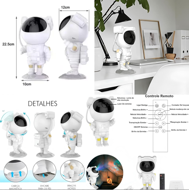 Mergulhe em um espetáculo de projeção de nebulosas e estrelas, criando um ambiente mágico e envolvente. Deixe-se levar pelo design inovador desse projetor único que chama a atenção de todos, que entram em sua casa. Crie uma Atmosfera Espacial Perfeita, com o PROJETOR ASTRONAUTA GALAXY, oferecendo praticidade e facilidade de uso. O principal diferencial desse projetor é o design criativo com o formato de astronauta, possibilita que ele seja usado também como decoração. O sucesso entre as crianças é geral, e os adultos se deleitam, com o céu estrelado fazendo o maior sucesso entre toda a família. Eles criam um ambiente relaxante e aconchegante ao projetar galáxias e estrelas no teto ou nas paredes da casa.